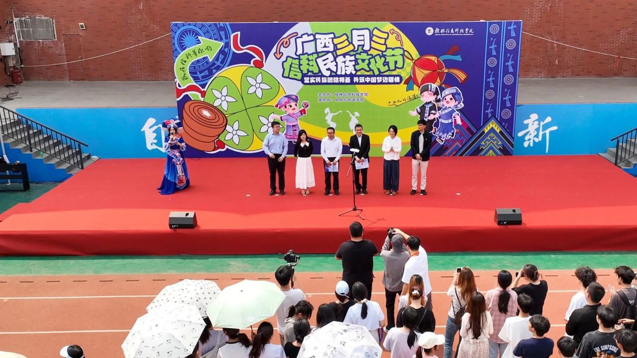 随着欢快的音乐响起,舞蹈《大地飞歌》拉开了活动的帷幕。舞者们身着色彩斑斓的民族服饰,翩翩起舞,展现了壮乡人民的热情与活力,瞬间点燃了现场气氛。3月27日下午14点,操场热闹非凡,“潮玩三月三·青春壮乡行”主题活动在这里盛大开幕。校领导在开幕式上宣布活动正式开始。