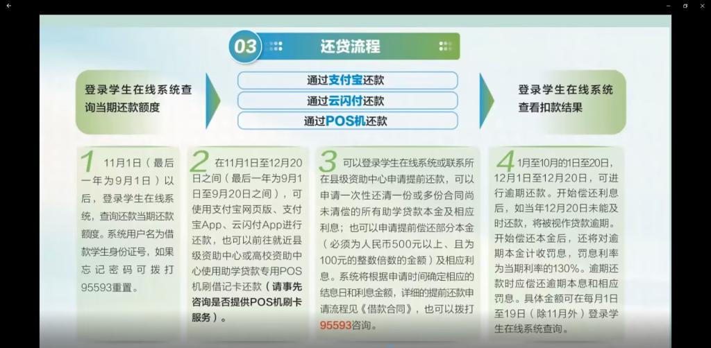 会上,周金悦老师详细阐述了毕业生生源地贷款还款流程、毕业确认、个人信息更新及相关情况处理程序和违约后果,以及支付宝还款功能使用方法。她强调,诚信是为人之本,个人征信报告关系到个人未来的发展,一定要按时还款还息,建立良好的个人信誉,常怀感恩之心,牢记国家和社会的关爱,树立远大理想抱负,感恩母校、社会和国家。同时,她还列举了往年失信同学的案例,阐述了失信问题的严重性。会后,周金悦老师针对学生提出的疑问给予了耐心解答。