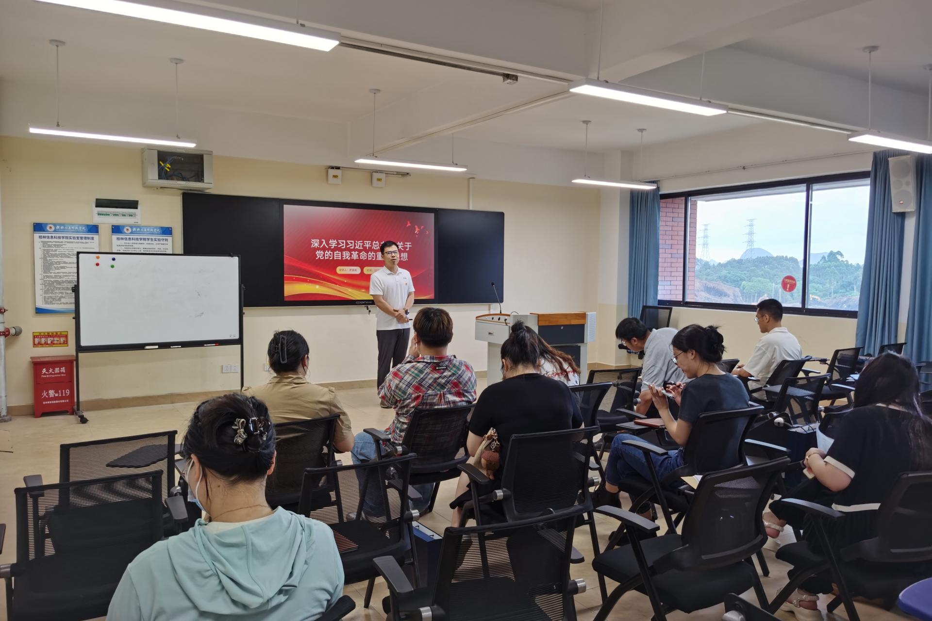 首先,由罗盛皓老师围绕“为什么要自我革命、为什么能自我革命、怎样推进自我革命”三个维度,学习贯彻习近平总书记关于党的自我革命的重要思想,全体党员教师要深刻领悟这一重要思想的科学内涵和实践要求,深刻把握贯穿其中的重大创新观点、科学方法和重要战略部署,更加自觉主动地以伟大自我革命引领伟大社会革命。领学结束后,学院第一教工党支部为第一第二季度过政治生日的党员教师颁发礼物。外贸与外语学院党委李刚书记向各位老师表达深切的祝福,并激励党员老师时刻牢记“党员身份”,将自我革命精神融入育人实践,在课程思政建设、学生成长指导中主动担当,以实际行动擦亮党员底色。简短而庄重的仪式,让党员们感受到组织的温暖与期许,进一步厚植信党爱党为党情怀。最后,学院第一教工党支部全体党员庄严重温入党誓词,铿锵誓言响彻会场,既是对初心使命的回溯,更是对自我革命、担当作为的庄严承诺。