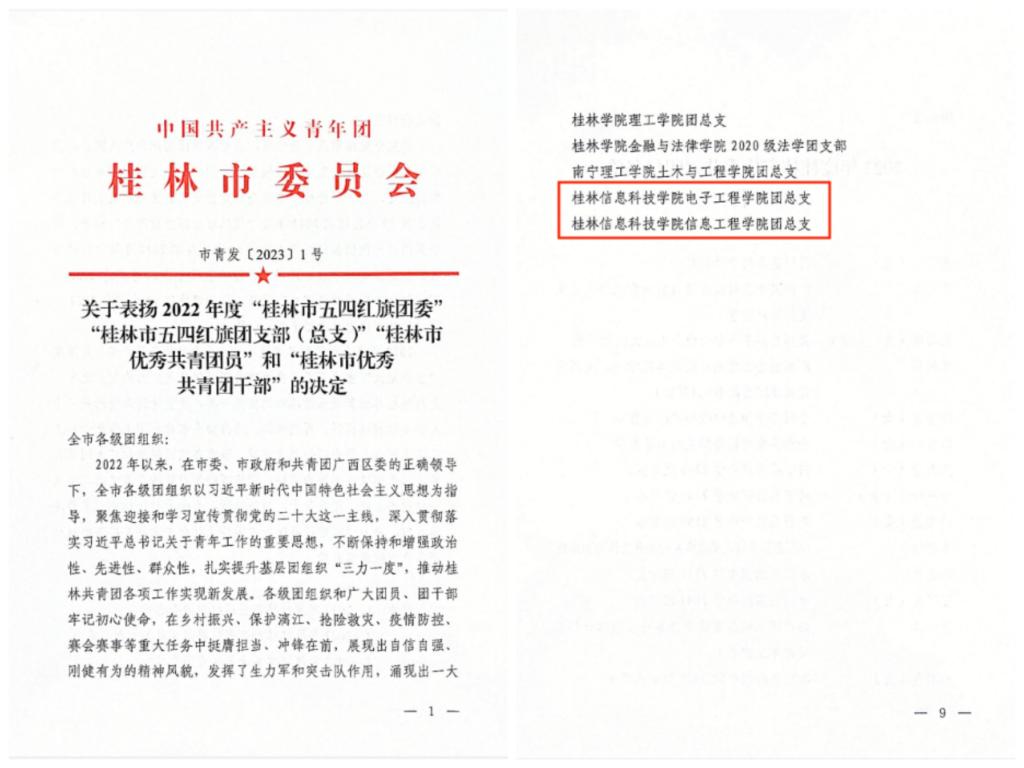 近日,共青团广西区委、共青团桂林市委相继印发了《共青团广西区委 广西青年联合会关于表彰广西共青团先进集体和先进个人的决定》、《关于表扬2022年度“桂林市五四红旗团委”“桂林市五四红旗团支部(总支)”“桂林市优秀共青团员”和“桂林市优秀共青团干部”的决定》,我校共计2个集体、7名个人光荣上榜。